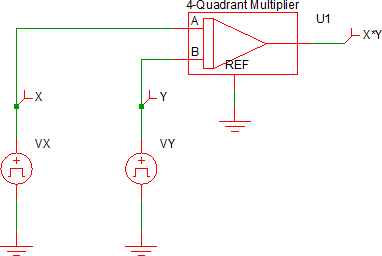 A basic four quadrant multiplier example schematic can be downloaded here: simplis_084_4_quad.sxsch. In this example, the amplitude and phase between the two sine wave sources is defined in the F11 window with a variable statement. The product of the two sine wave sources is output from the 4-quadrant multipler.