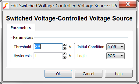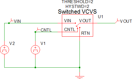 | CNTL | I | On/Off control voltage | The threshold voltage, hysteresis, and logic of the control voltage are set in the input dialog box described in Editing_the_Switched_VCVS. |