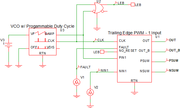 The Trailing Edge PWM block sums all positive inputs ( PIN1, PIN2, ...) and outputs that sum on the PSUM pin. Similarly, all negative inputs are summed and output on the NSUM pin. The output signal, OUT is high when PSUM is greater than NSUM, except during the interval when the clock signal is high in which case OUT is forced low.