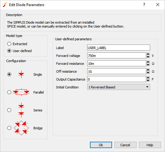| Limit maximum off resistance | Checked | none | Limits the off resistance for the diode. For some SPICE models, this will produce a SIMPLIS model which runs faster. |