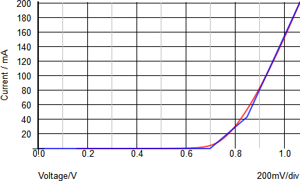 Below is a typical PWL approximation of the Forward Bias Current characteristic of the diode, with the SPICE curve in red and the PWL curve in blue.
