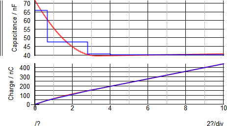 Below is a typical PWL approximation of the Charge characteristic of the Drain-Source capacitor. As SIMPLIS uses the charge vs. voltage in a simulation, this characteristic curve is used to curve fit the non-linear capacitance. As a result, the capacitance is piecewise constant, and is calculated from the charge vs. voltage characteristic. The SPICE curves are shown in red and the PWL curves in blue.