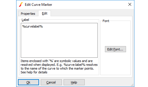 | Label | Text of the marker's label. %curve:label% automatically resolves to the curve's label. If the curve name is edited with menu Curves | Rename curve this value will reflect the change. You can of course enter any text in this box. You can also use expressions in the same manner as for cursor dimensions. See Label in Editing Style or/and Format of Cursor Dimension. |