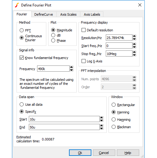 A Fourier spectrum of a signal can be obtained in a number of ways. You have a choice of using the default settings for the calculation of the Fourier spectrum or you can customise the settings for each plot. The following menus use the default settings: