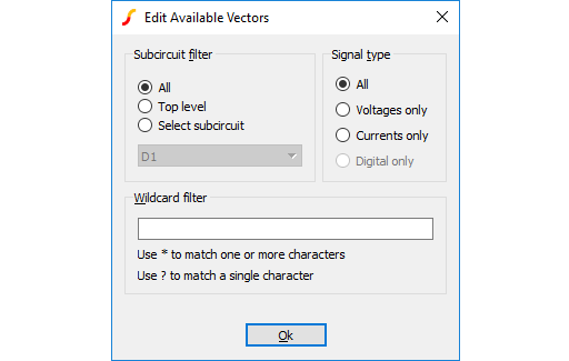 This allows you to select what is displayed in the available vectors dialog. This is useful when simulating large circuits and the number of vectors is very large.