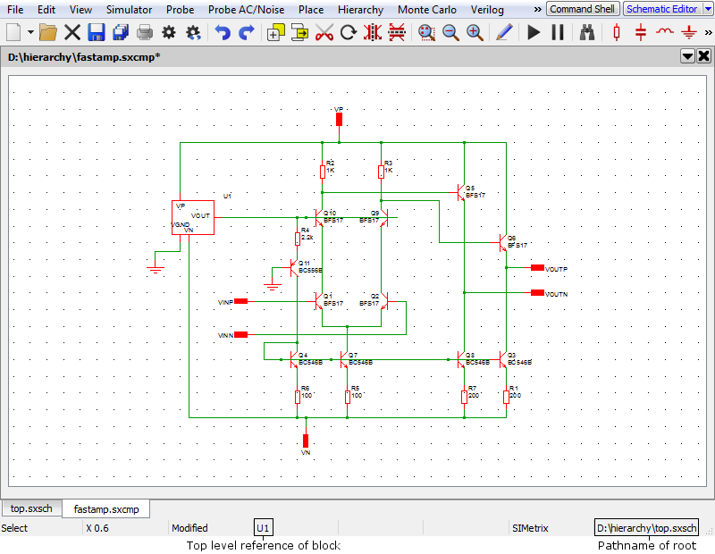 This has two instances of the block fastamp.sxsch U1 and U2. Suppose you wanted to plot the voltage of a node inside U1. The schematic fastamp.sxsch is open but to which block does it refer? The answer is that it will refer to the most recent block that was used to descend into it. The block that a schematic refers to is always displayed in the schematic's status bar as illustrated below