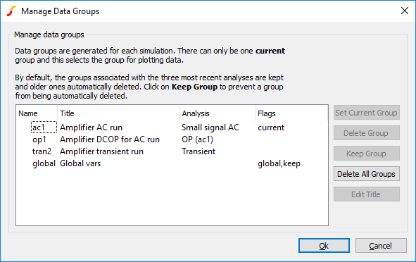 There are occasions when you wish to - say - plot the difference between a node voltage for different runs. You can do this in SIMetrix using the menu by entering an expression such as 'vector1 -vector2 ' in the y-expression box, where vector1 and vector2 are the names of the signals. However, as the two signals come from different runs we need a method of identifying the run. This is done by prefixing the name with the group name followed by a colon. The group name is an analysis type name (tran, ac, op, dc, noise, tf or sens) followed by a number. The signal name can be obtained from the schematic. For voltages, move the cursor over the node of interest and you will see the name appear in the status box in the form "NET=???". For currents put the cursor on a device pin and press control-P. The group name is displayed in the simulator progress box when the simulation is running. You can also find the current group by selecting menu . The current group is marked current in the Flags column.