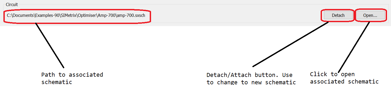 The circuit definition section is where the associated schematic may be defined and opened. The optimiser GUI works on a single schematic. The GUI defines the analyses to be run overriding any definitions in the schematic itself.