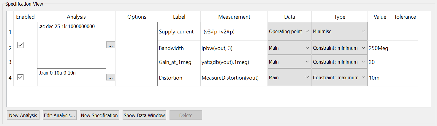 The specification view is where the analyses and measurements are defined. There may be one or more analyses defined and each analysis may have zero or more associated measurements. One and only one of the measurements must be defined as the objective function, defined as either Minimise or Maximise. This is the quantity that the optimiser will seek to minimise or maximise. Other measurements may be constraints, which the optimiser will seek to satisfy but will not maximise or minimise beyond meeting the constraint value. There may be any number of constraints.