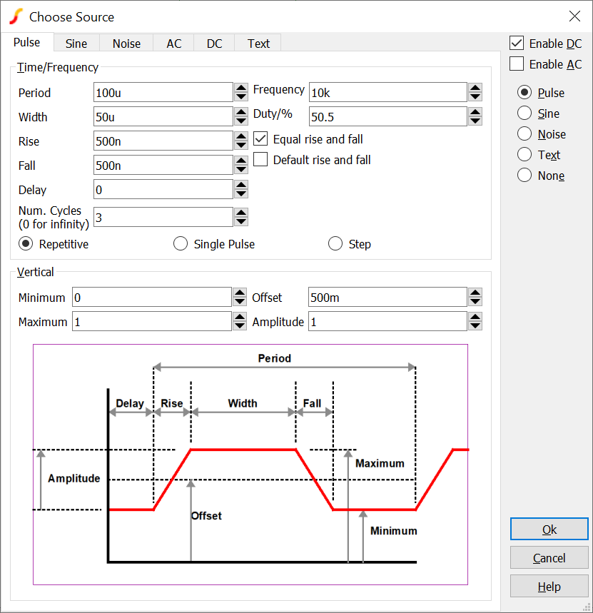 To specify the signal for the source, select then choose the popup menu Edit Part... or press F7. This will bring up the dialog box shown below. (In SIMPLIS simulation mode it will have an additional check box - see notes below)