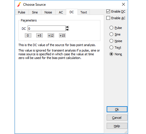 Specifies DC value for bias point calculation. If one of sine, pulse, noise, piece wise linear, exponential, or single frequency fm sources is also specified, this value will be ignored and the time=0 value used instead.