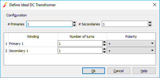 To define an ideal transformer, select the menu . This will open the following dialog box: