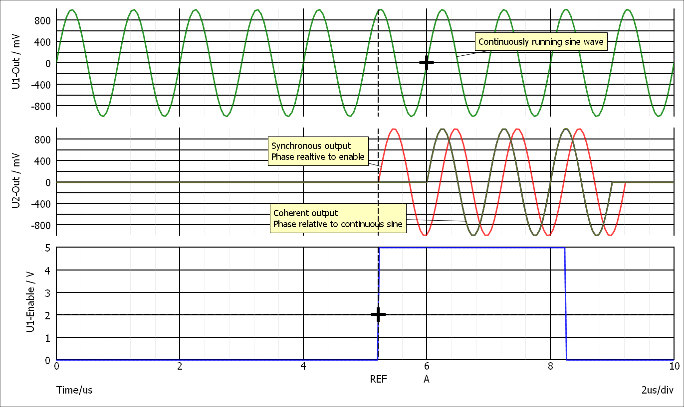 Generates a sinusoid which can be gated to external enable signal. The device only outputs complete cycles. So, for example, when the enable turns off, the device will complete any cycle that it has already started. Similarly when the enable turns on, the cycle starts at zero degrees. The mode option controls whether the sine starts immediately (synchronous mode) or in sync with a continuously running sine (coherent mode).
