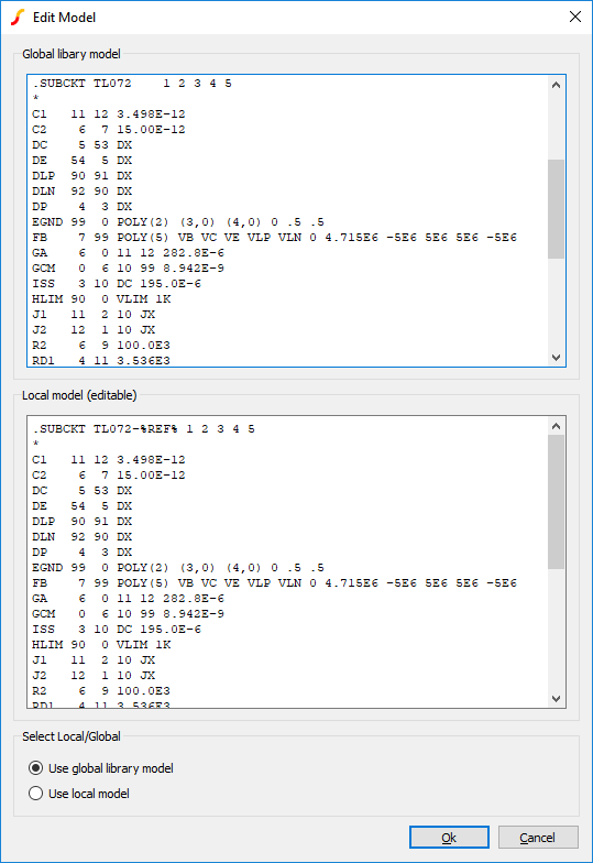 The top half of the above box shows the definition of the model in the library. The bottom half shows an editable local copy of the model. To begin with, this will be exactly the same as the library model shown in the top half. But you may edit this as desired (but note you should not edit the top line starting .subckt or bottom line .ends). This model will then be used instead of the global library model if you select the check box at the bottom: Use local model.