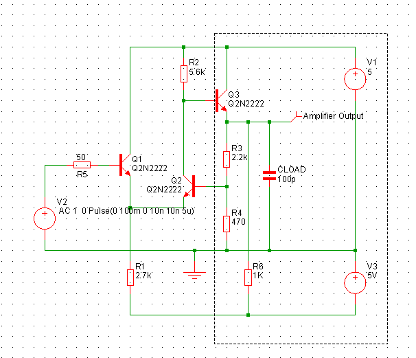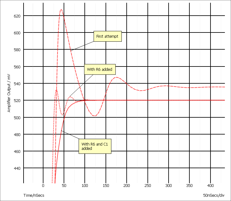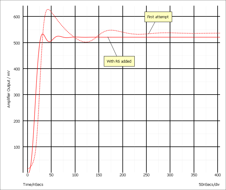 This is a simple feedback amplifier designed to amplify a 100mV pulse up to around 500mV. The basic requirement of the design is that the pulse shape should be preserved, DC precision is important but is not critical. The above is our first attempt at a design but has not yet been optimised.