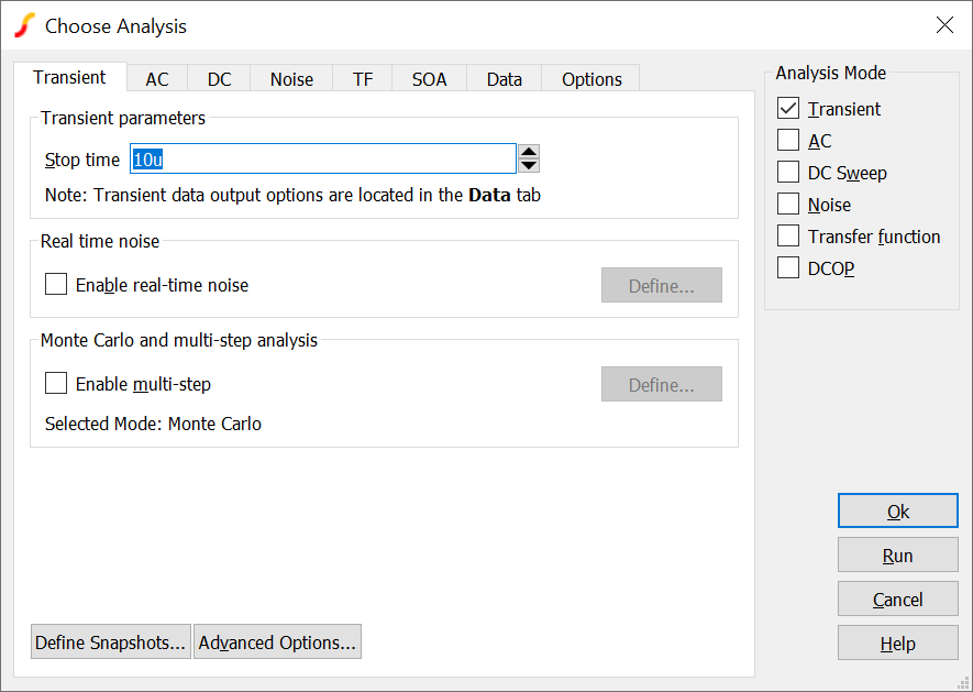 Click AC check box and uncheck the Transient check box. The details of the AC sweep have already been set up - click the AC tab at the top to see them.