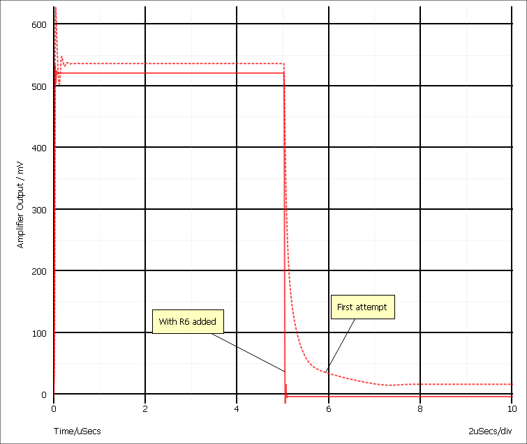 You will notice that a new curve is displayed each time you run a new simulation. This is the default behaviour but this can be changed so that, for example, old curves are deleted leaving only the latest on view. To do this, double click the probe - that is the object labelled "Amplifier Output". Set History to 1 and close the box. (For more information see Probe Options Sheet). You can change the number of curves that are shown at any time using the popup menu .